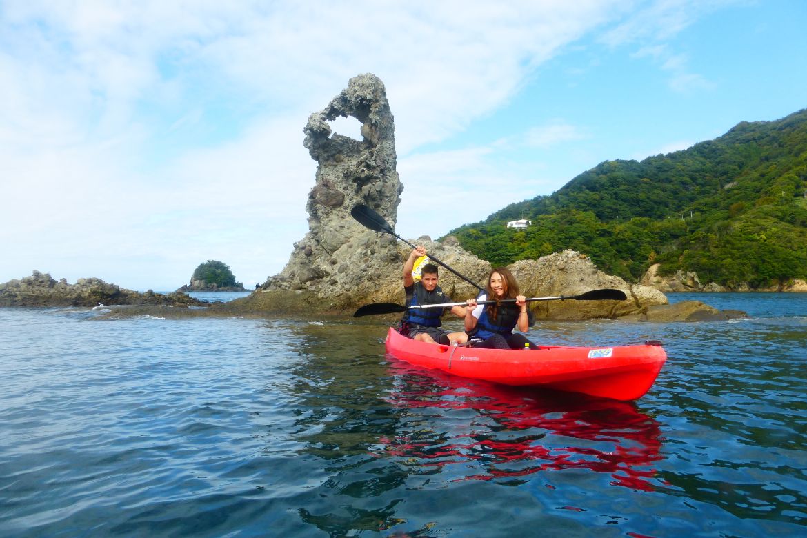 99%の方が初めての体験。シーカヤックの舞台はダイナミックな自然です。天気、海況、風など日々変化します。穏やかで透明度抜群の日もあれば、多少ざわついて濁りのある日もあります。その日その日の状況に合わせて、安全対策のスペシャリスト、たっちゃんがガイドします。タンデムカヤックは安定性抜群、転覆はまずしません。小さなお子さんがいるファミリーこそ安心して楽しんでください。身長130cmまでなら3人乗りもOK。安全管理を徹底している伊豆自然学校ならではです。