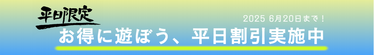 | 平日割引 | 2025年6月20日(金)まで 8,300円/大人(中学生以上)、6,500円(小学生以下)※3人乗り小児は1,500円 公式ホームページよりお申し込みください ●通常の料金で予約してください(こちらで修正します) ●備考欄に「平日割で」と入力してください ●お支払いは「現地払い」を選択してください ●当日、現地で「現金」でのお支払いをお願いします ※平日割とリピーター割の併用はできません。該当の場合は、リピーター割のみの適用となります。 |